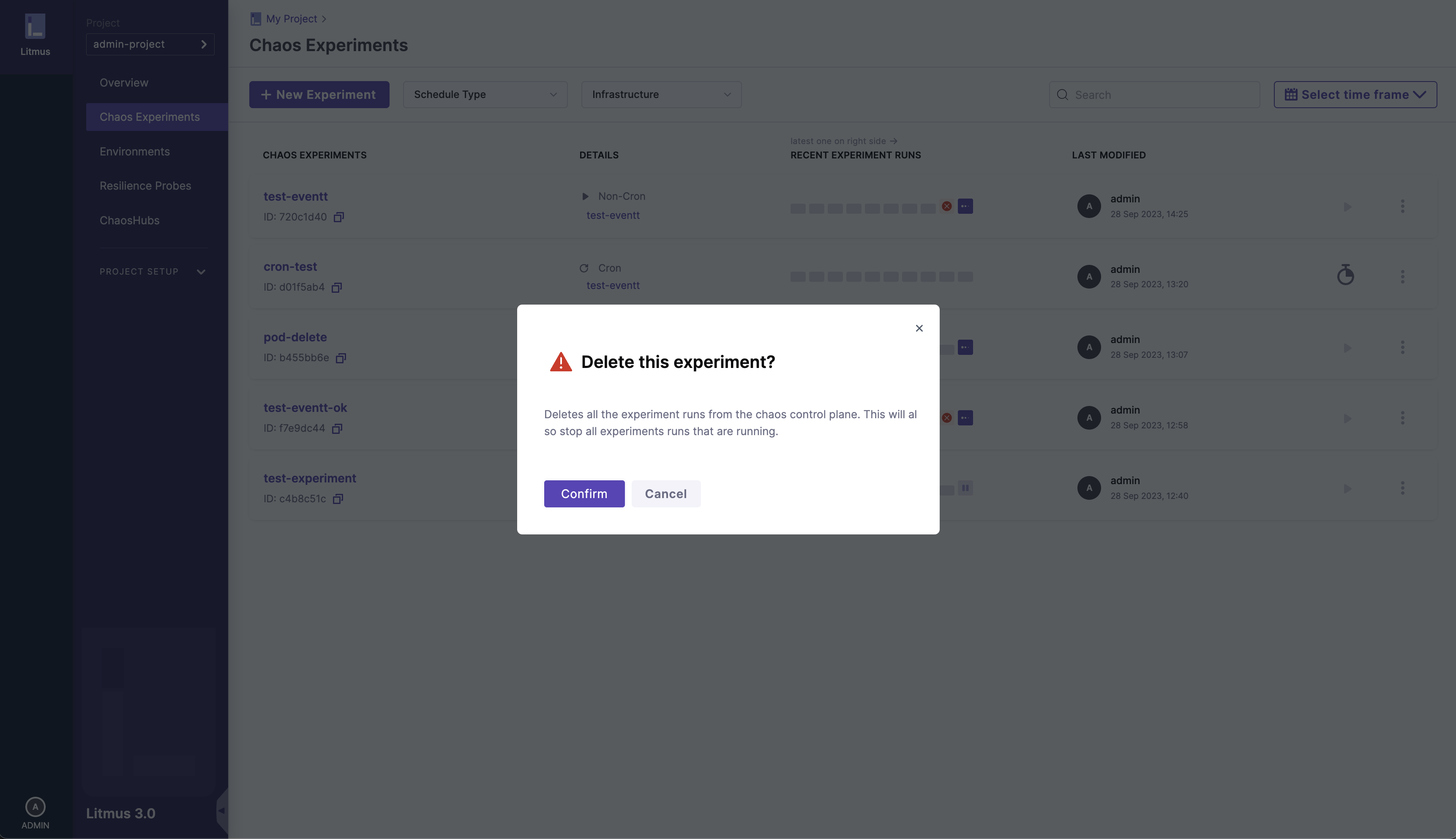 After opening the options menu and clicking on the Delete Experiment option, you'll see a prompt in order to confirm your action. Please ensure that you want to delete the selected chaos experiment and click the Confirm button: